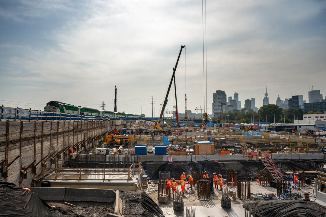 Construction of the new multimodal East Harbour Transit Hub is underway to serve as a major interchange in Toronto’s east end, connecting passengers to the regional GO Transit network and future Ontario Line services. While Union Station remains Canada’s busiest transportation hub with more than 300,000 daily passengers and connections to subway, bus, streetcar, and regional rail services, East Harbour is being developed to relieve pressure from Union Station by an estimated 14% and is anticipated to be the second busiest train station next to Union Station.