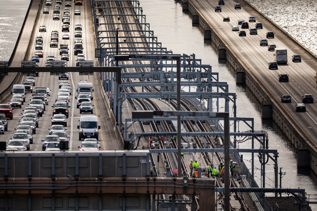 The floating bridge can shift up to 7 feet laterally and can rise and fall several feet as lake levels change. To accommodate this type of dynamic movement, we designed a first-of-its-kind expansion joint to safely deliver power to the trains moving across the bridge.