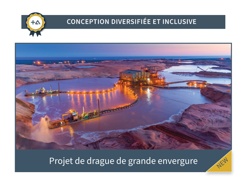Une nouveauté cette année, la catégorie conception diversifiée et inclusive récompense une équipe de projet qui a créé une solution novatrice et inclusive en appliquant nos principes de conception diversifiée et inclusive. Il s’agit d’une équipe dont le travail novateur aura établi une nouvelle norme en matière de conception inclusive. Nous sommes fiers d’annoncer que le projet de drague de grande envergure de Kenmare a remporté le tout premier prix de la catégorie Conception diversifiée et inclusive!